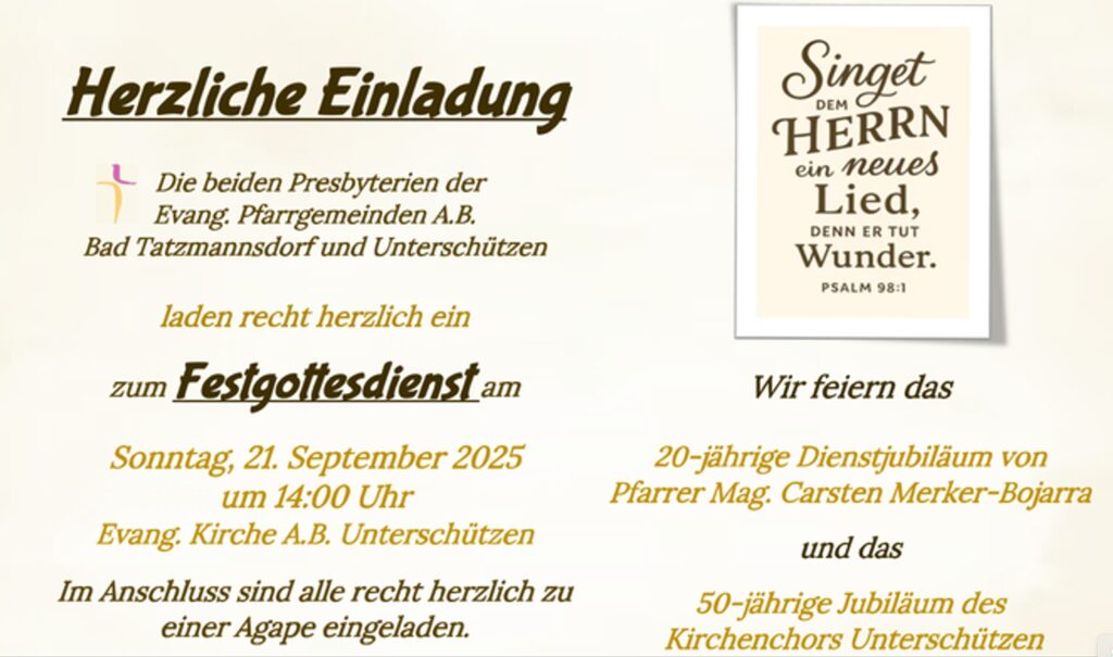 50 Jahre gemeinsames Singen, 50 Jahre Leidenschaft, 50 Jahre Gotteslob und 50 Jahre gelebte Gemeinschaft. Seit einem halben Jahrhundert tragen Sie mit Ihrem Liedgut, Ihrem Engagement und Ihrer Freude zur frohen Botschaft der evangelischen Pfarrgemeinde Unterschützen bei. Dafür in diesem Gottesdienst Gott danke zu sagen und auch Ihnen allen, die dem Kirchenchor angehört haben und heute angehören, das halte ich für wichtig, weil damit zum Ausdruck gebracht wird: Hier gibt es Menschen, die sich mit ihrer musikalischen Begabung einbringen in und für die Gemeinschaft der Pfarre.