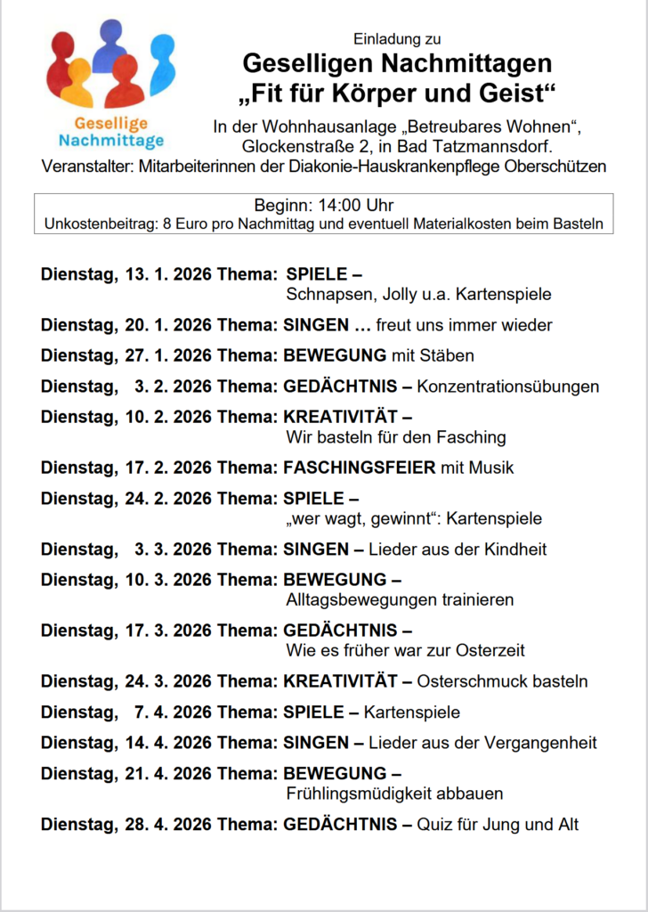 Diakonie – Gesellige Nachmittage, 1. Quartal 2026 in Bad Tatzmannsdorf 2. Januar 2026 Dietmar Stipsits Veranstaltungen