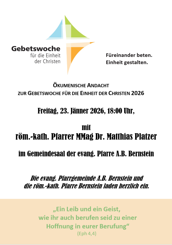 Weltgebetswoche für die Einheit der Christen, 23.01.2026, 18.00 Uhr, evang. Gemeindesaal Bernstein 12. Januar 2026 Dietmar Stipsits Veranstaltungen