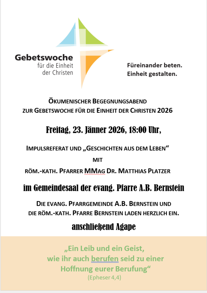 Weltgebetswoche für die Einheit der Christen, 23.01.2026, 18.00 Uhr, evang. Gemeindesaal Bernstein