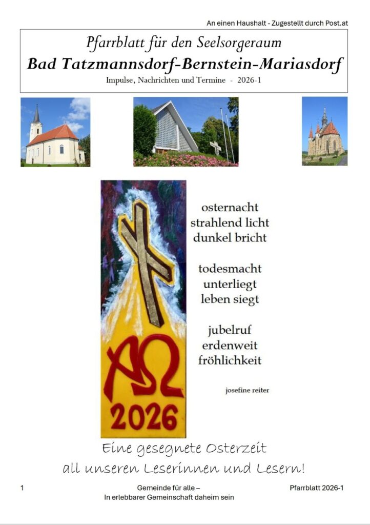 Neues Pfarrblatt 2026-1 ist erschienen 27. März 2026 Dietmar Stipsits Aktuelles Unser neues Pfarrblatt 2026-1 ist erschienen.